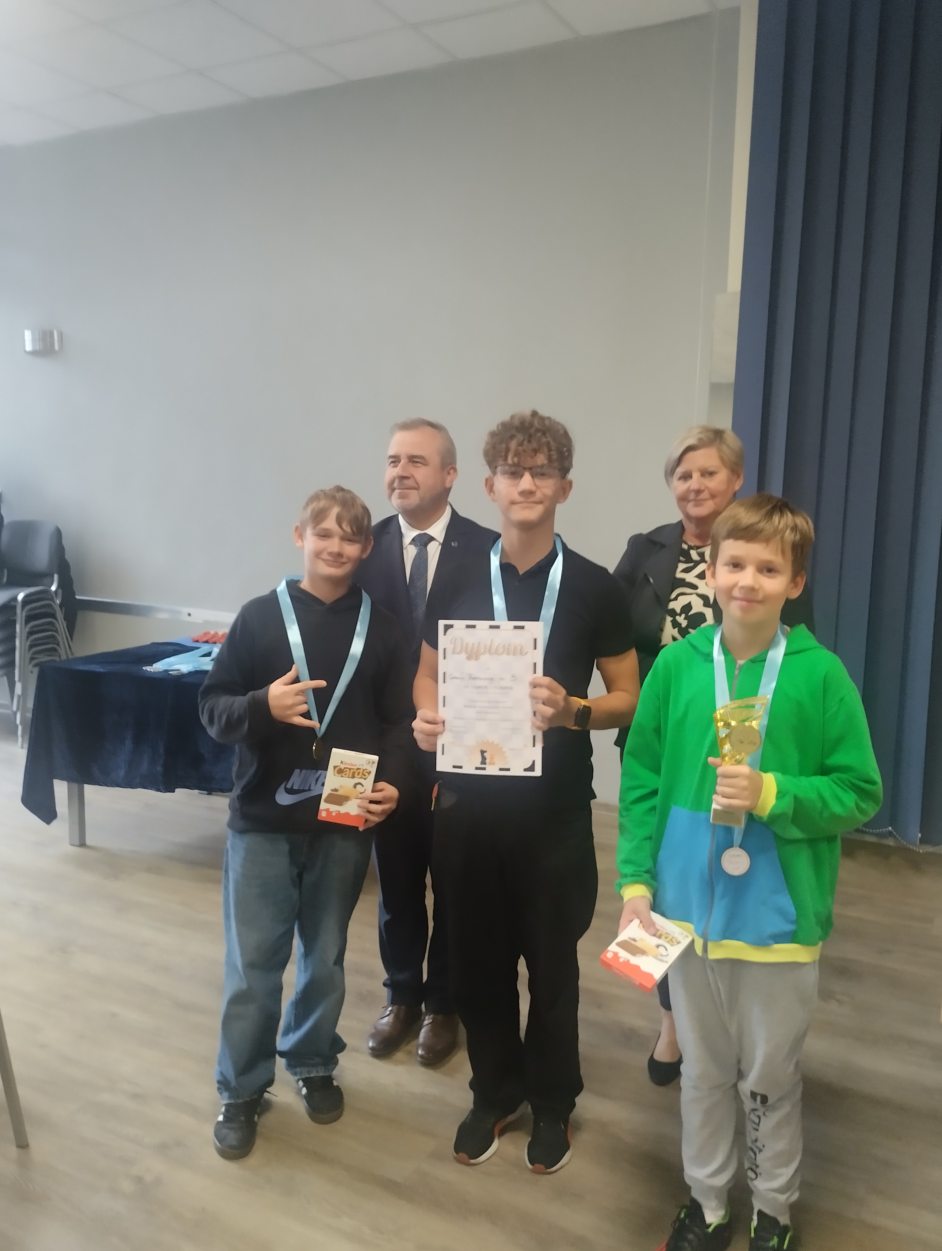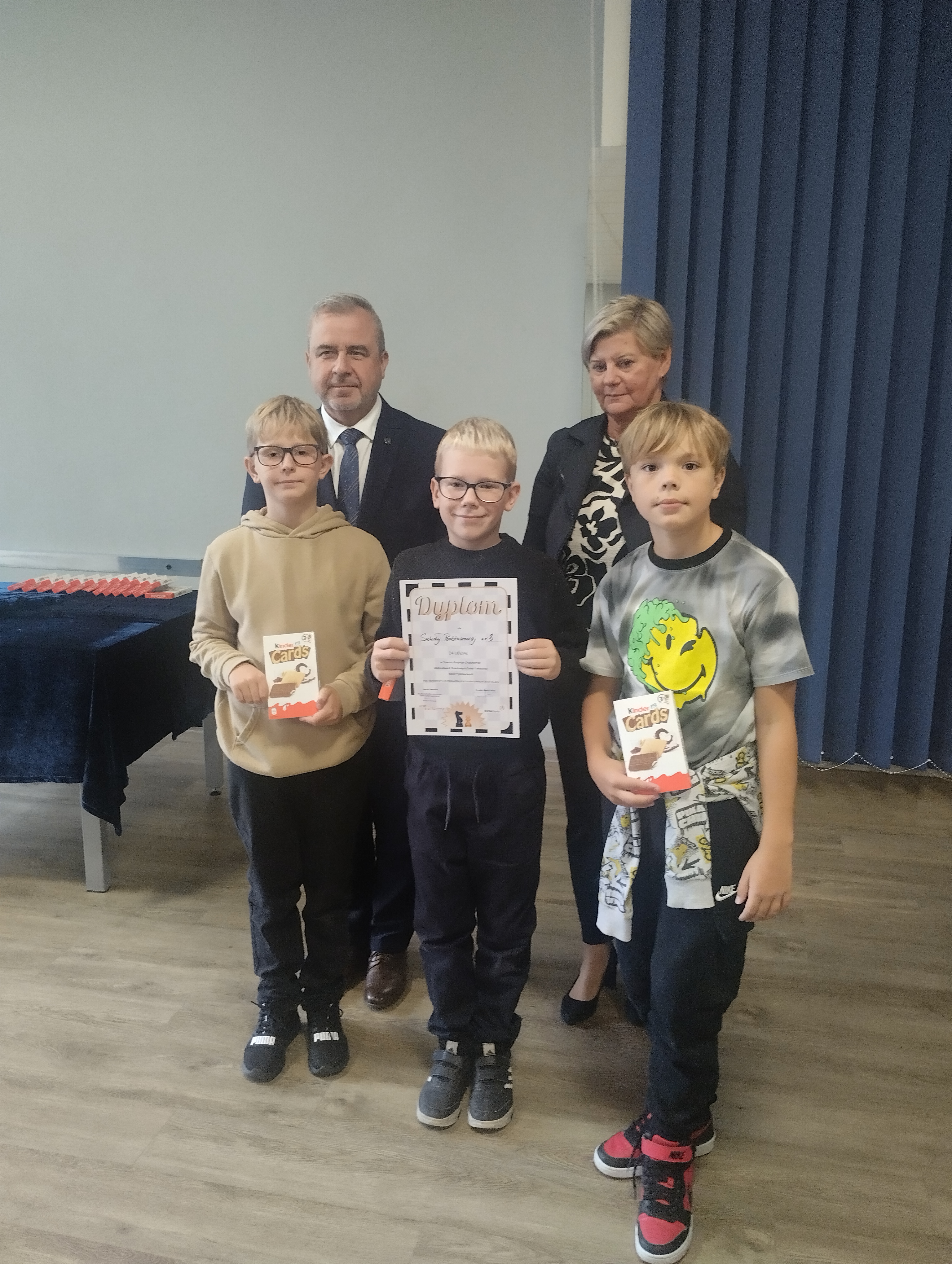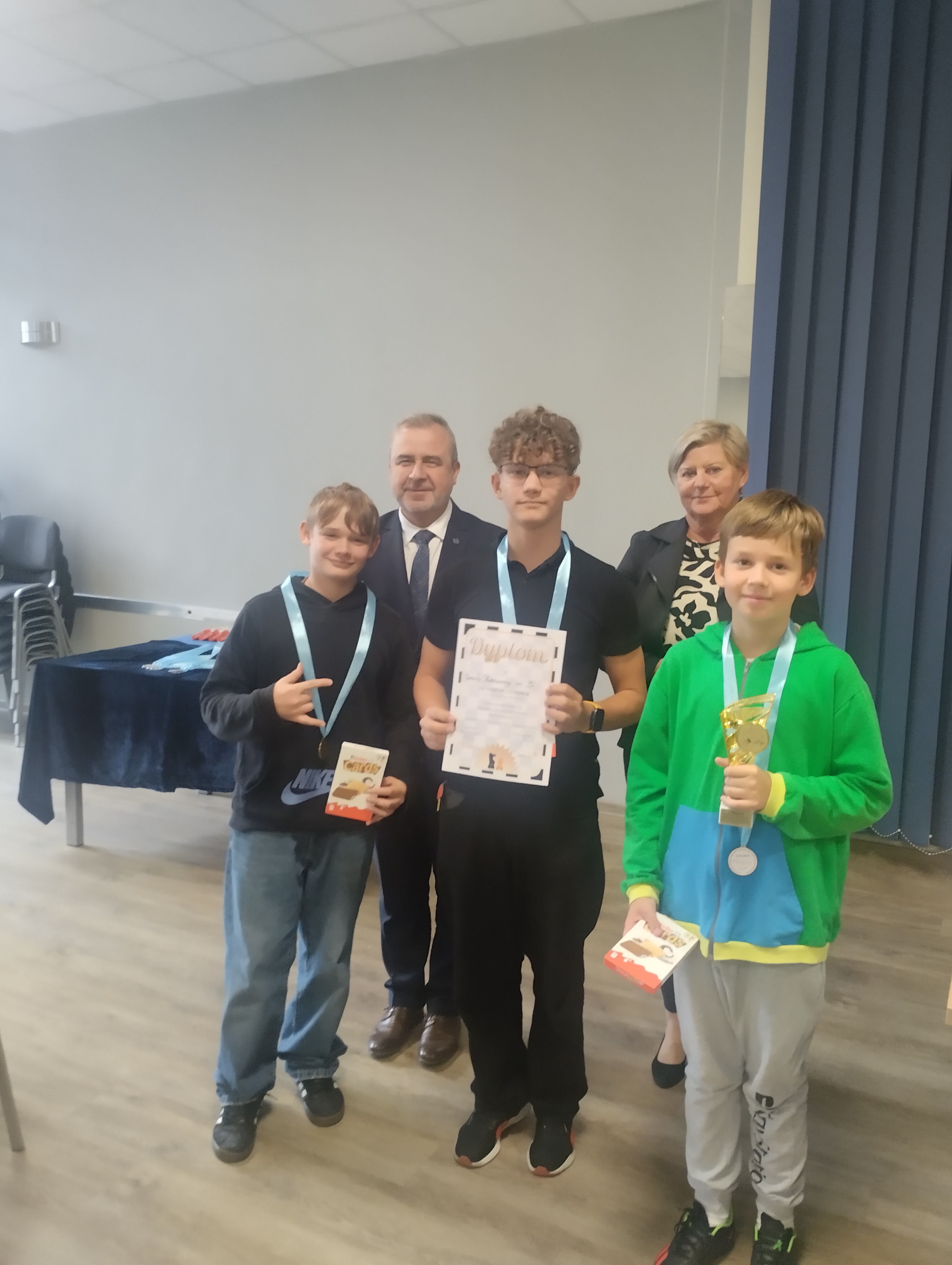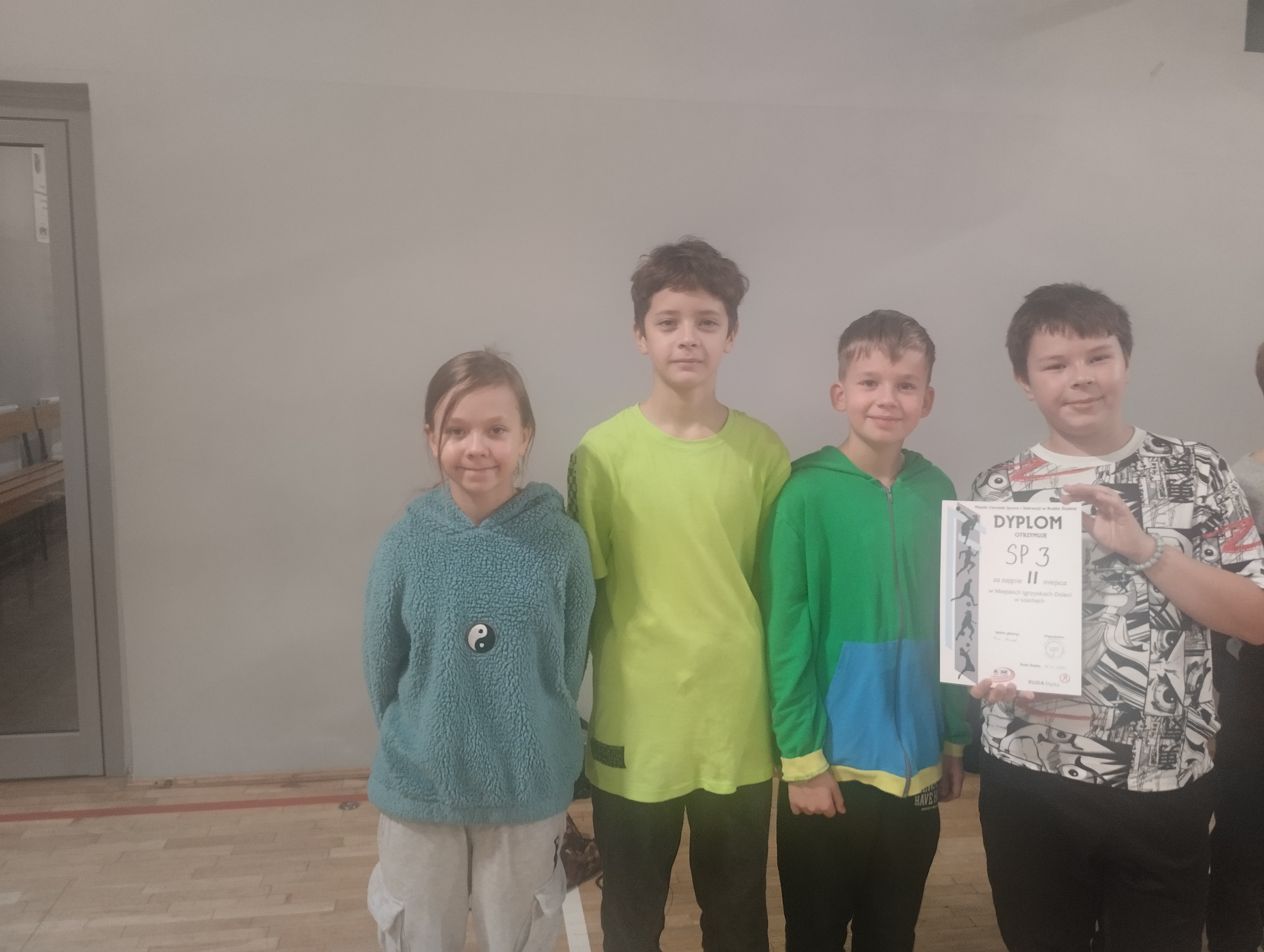 23 września odbyły się w naszym mieście „III Rudzkie Drużynowe Mistrzostwa Szachowe Dzieci i Młodzieży Szkół Podstawowych". Imprezę patronatem honorowym objął sam Przezydent Miasta Ruda Śląska, Pan Michał Pierończyk. W zawodach brali udział uczniowie z kilku rudzkich szkół. Nasza szkoła także miła tam swoich reprezentantów. Zarówno grupa młodsza (klasy I-IV) jak i grupa starsza (klasy V-VIII) spisały się znakomicie. Grupa młodsza w składzie Grabowski Jakub, Sarzyński Filip, Świercz Marcin zajęła V miejsce, natomiast grupa starsza w składzie Dominik Dybała, Nadia Proske oraz Oliwier Podlewski zdobyła I miejsce. Zawody były bardzo udane, a wszyscy zawodnicy otrzymali słodkie upominki.